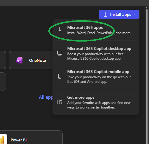 - The apps page will open. Click the down arrow on "Install apps", click "Microsoft 365 apps".