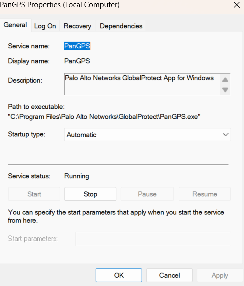 If you see the message "Could not connect to the GlobalProtect service. Make sure the GlobalProtect service is running." Open Services (type services after clicking on the Start Menu) and make sure the PanGPS service is running. Otherwise, double-click PanGPS and select Start