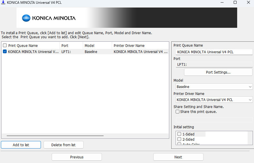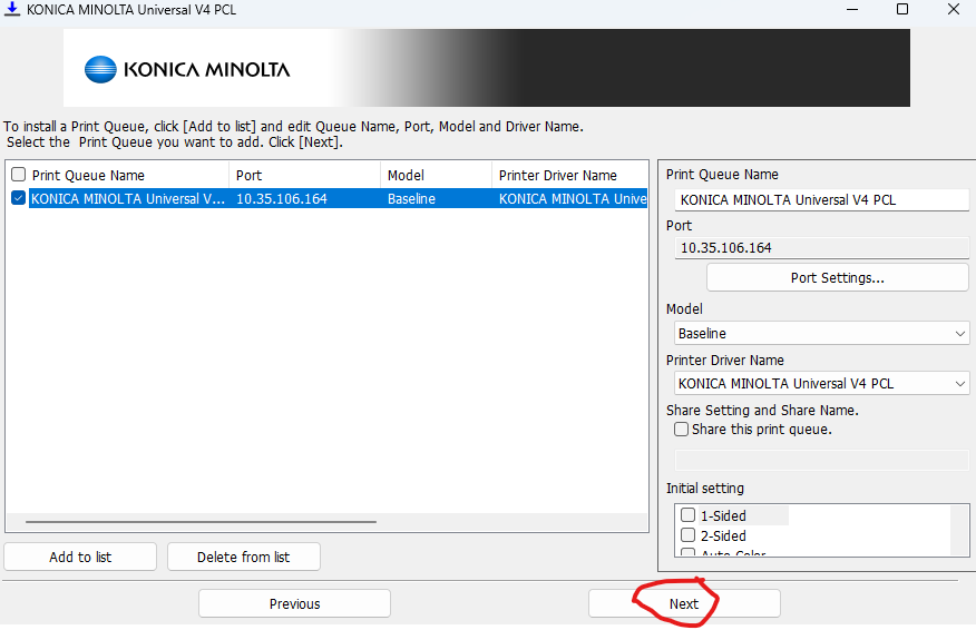 - Select "Add to list" on the set up screen; this should add a new printer to the list above; you can rename it in the "Print Queue Name" section as you would like