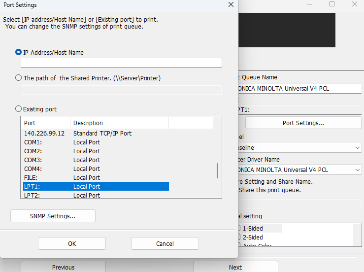 - Select "Port Settings" and select the option IP Address/Hostname; this will allow you to enter the printer's address