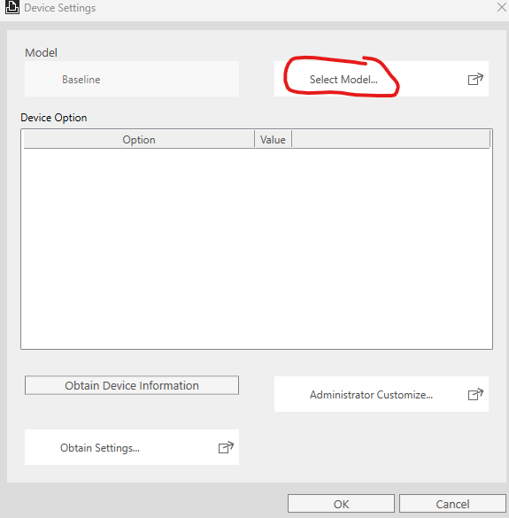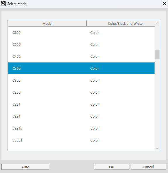 The next settings window should prompt you to select a model; press that, then search for C360i and chose "OK"
