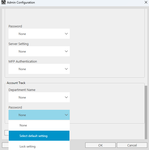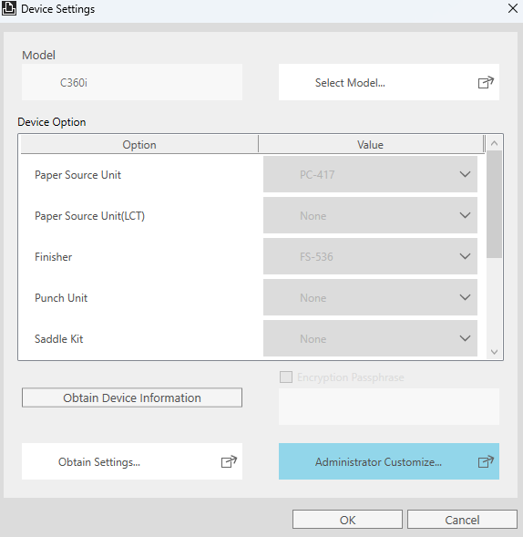 - After selecting the correct model, you should be able to enter the Account Track code which will allow you to print; to do so, select "Administrator Customize", then scroll down to the "Account track" section