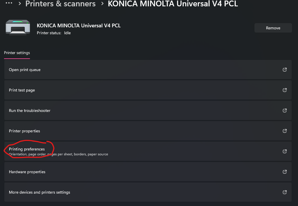 - Once here, you'll want to search for the newly installed printer based on the name you gave it and select "Printing Preferences"