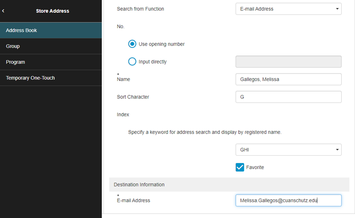 - Check the Favorite box if you want it on the list of favorites on the copier. This is for the most common email addresses you will be sending scans to. For someone you scan-email to a couple times a year, no need to check this box, but you can still add them. You will search for them by their last name the few times you scan-email to them.